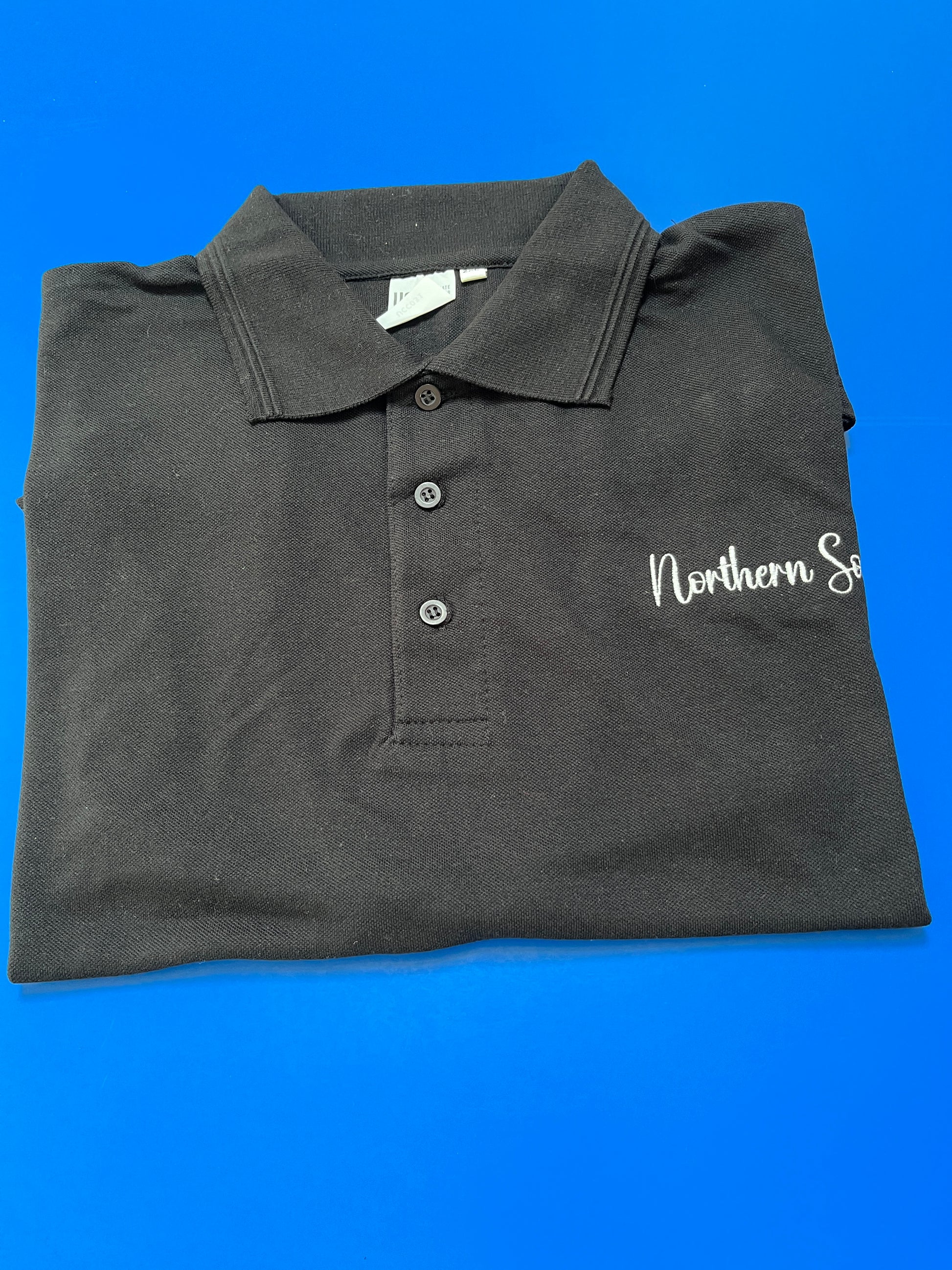 Mens Northern Soul, black polo shirt, black tipped collar. custom embroidered in UK.