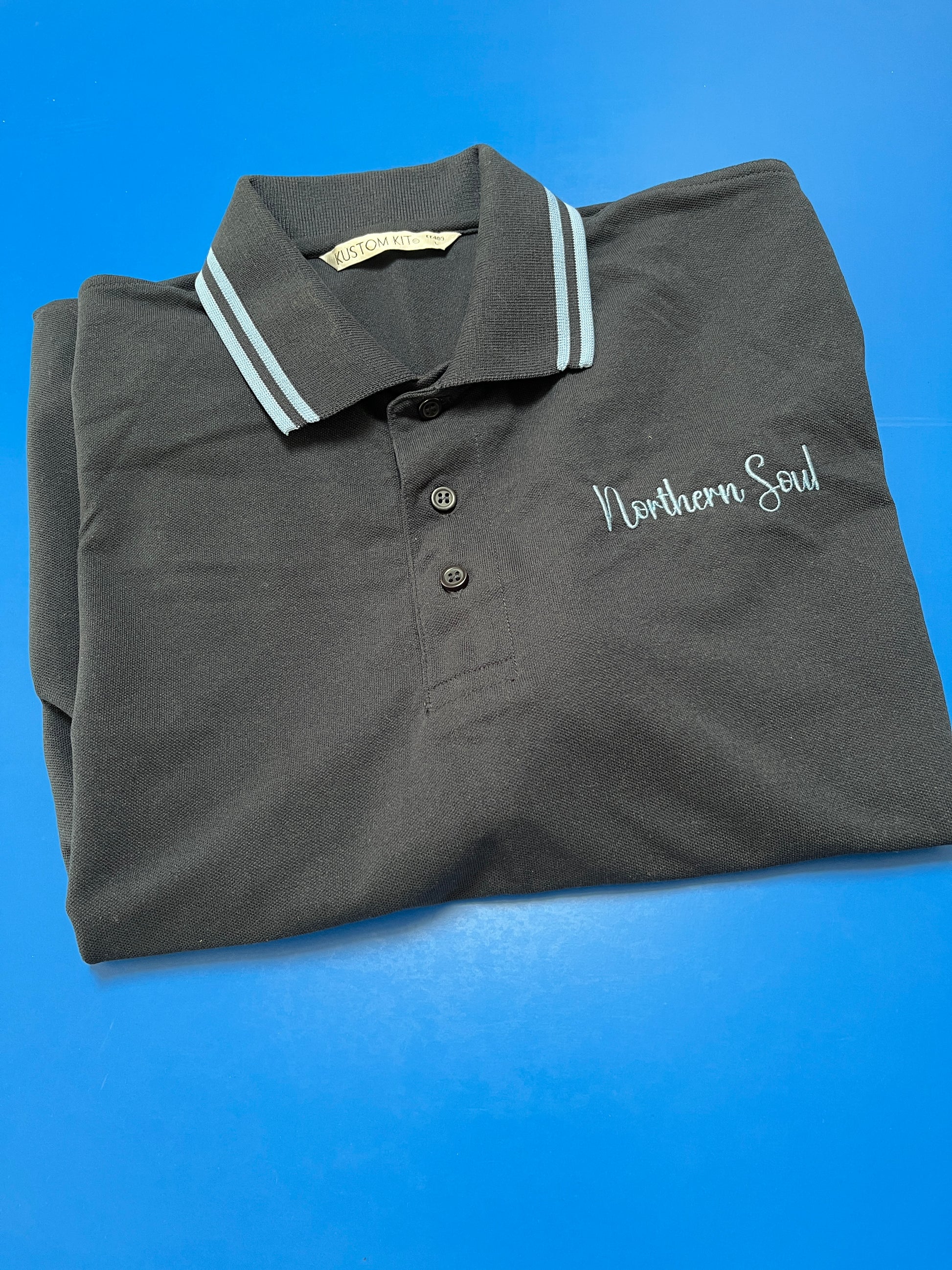 Mens Northern Soul, navy blue polo shirt, light blue tipped collar. custom embroidered in UK.