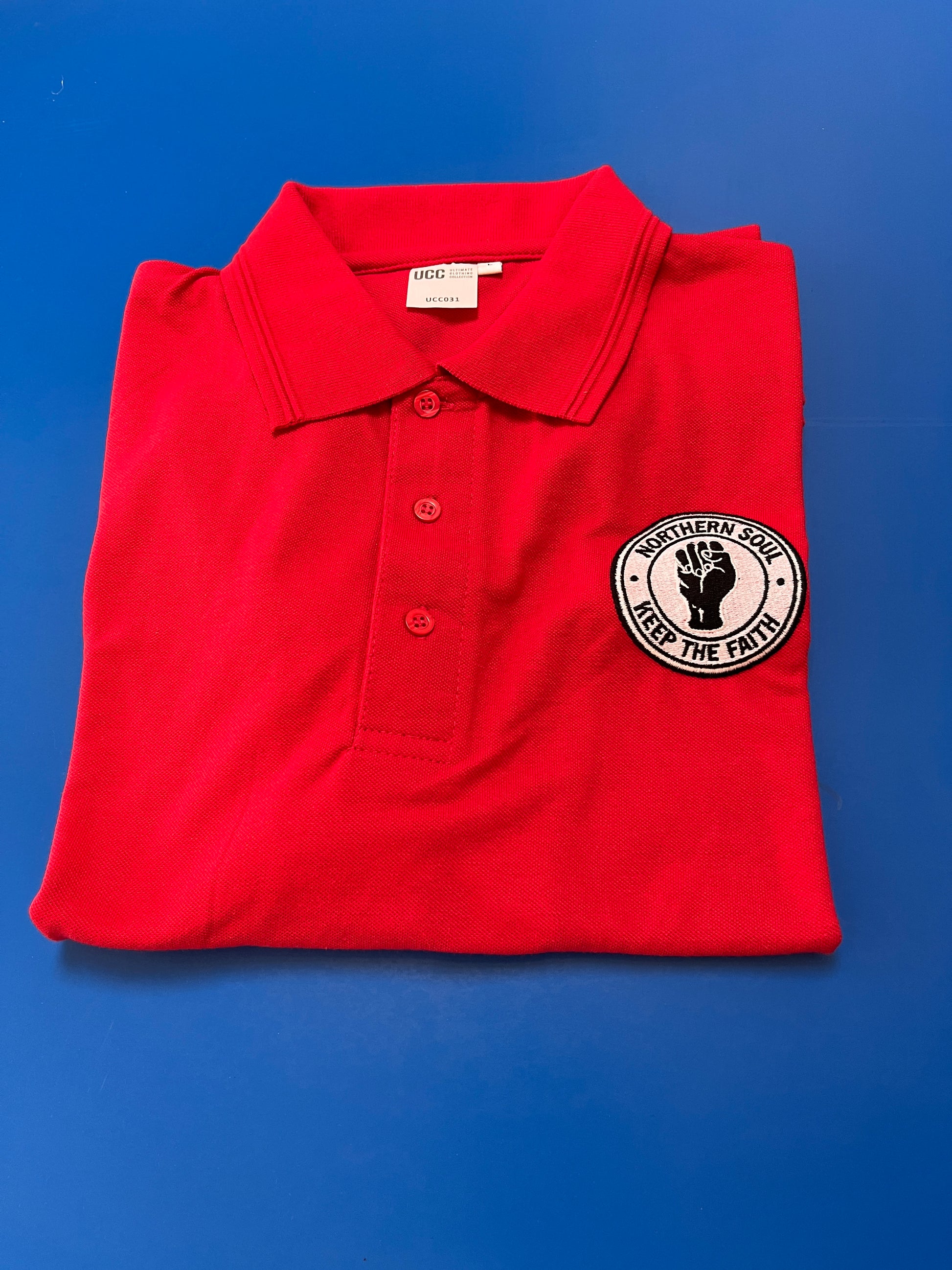 Mens Northern Soul, Red polo shirt, red tipped collar. custom embroidered in UK.