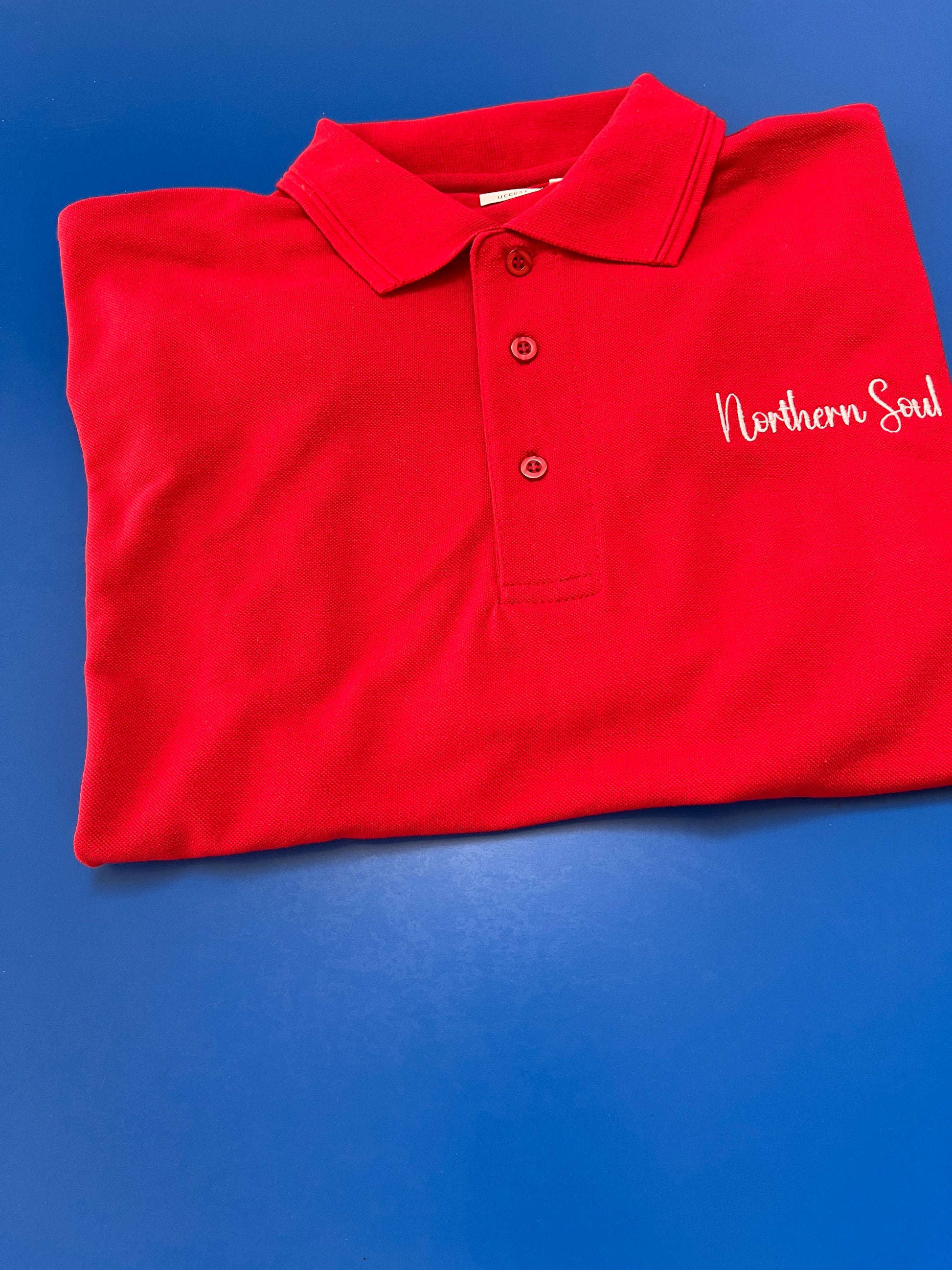 Mens Northern Soul, Red polo shirt, Red tipped collar. custom embroidered in UK.